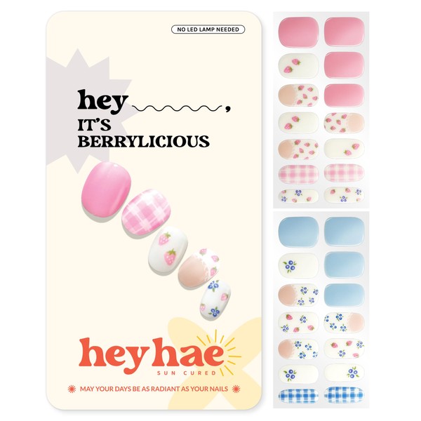 Heyhae Semi Cured Gel Nail Strips | No LED Lamp Needed | Summer, Solid, Pink | Easy Apply & Remove, Salon Quality | Includes 28 Strips, 1 Prep Pads, Nail File & Wooden stick - Hey, It's Berrylicious