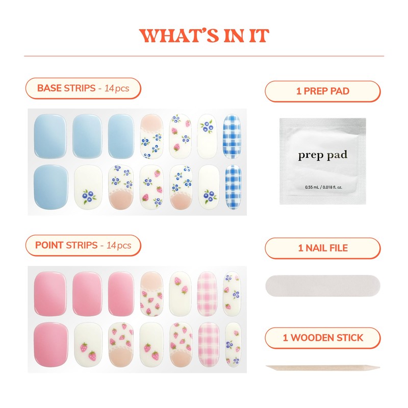 • Enjoy a complete package of fresh salon quality nails done at ease everywhere and anywhere you go! Package includes: 28 strips, 1 Prep pad, 1 Nail file, & 1 Wooden stick.