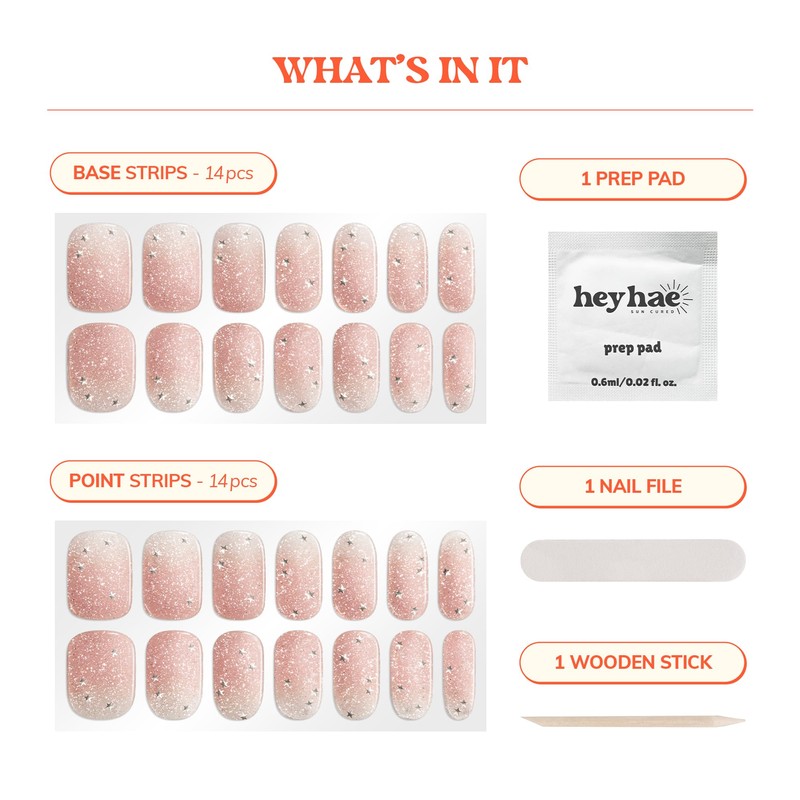 - Full set - Everything you need is included in the package. Have your nails done at ease with our complete set that includes: 28 strips, 1 Prep pad, 1 Nail file, & 1 Wooden stick.