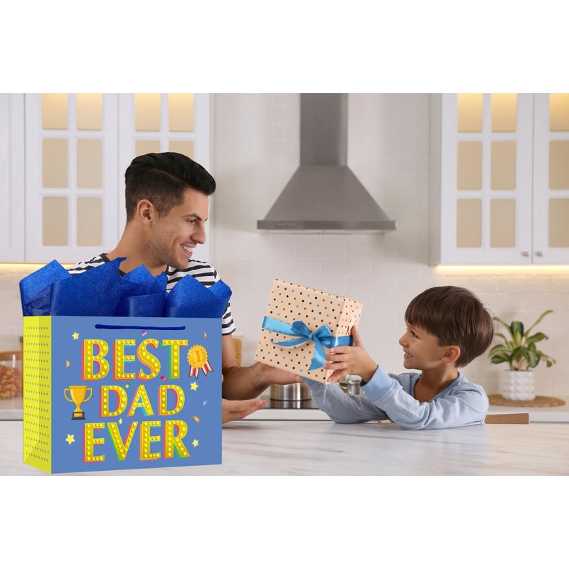 - Best Dad Ever Gift Bag with Tissue Paper: Featuring the iconic “Best Dad Ever” lettering, this colorful bag comes with 2 sheets of blue tissue paper, making it the ideal choice for wrapping Happy Father's Day Paper Bag for Men Dad. It’s a quick and easy way to present your thoughtful gifts while adding an extra touch of charm to the celebration.
