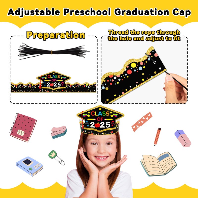 - Graduation paper hats : Our graduation paper hats for kids come in a set of 24 pieces, each with an elastic rope for an adjustable fit.you can write the name or other information on the hat as you like,make every child's Preschool Graduation Cap memorable and unique!