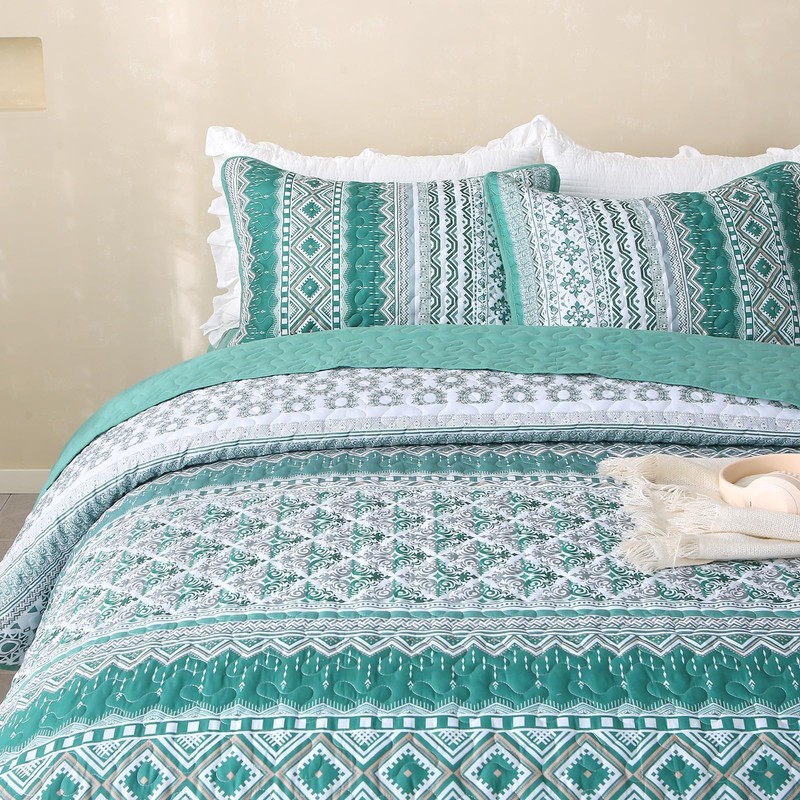 - 【PACKAGE & SIZE】: Queen green boho quilt set includes 1 reversible quilt (96"x 90") + 2 standard pillow shams (20"x 28"). No Pillow Insert Includes. Tips: If you wish the bedding coverlet is a little longer to cover more of the side of the bed, you may have a low bed or choose a larger size