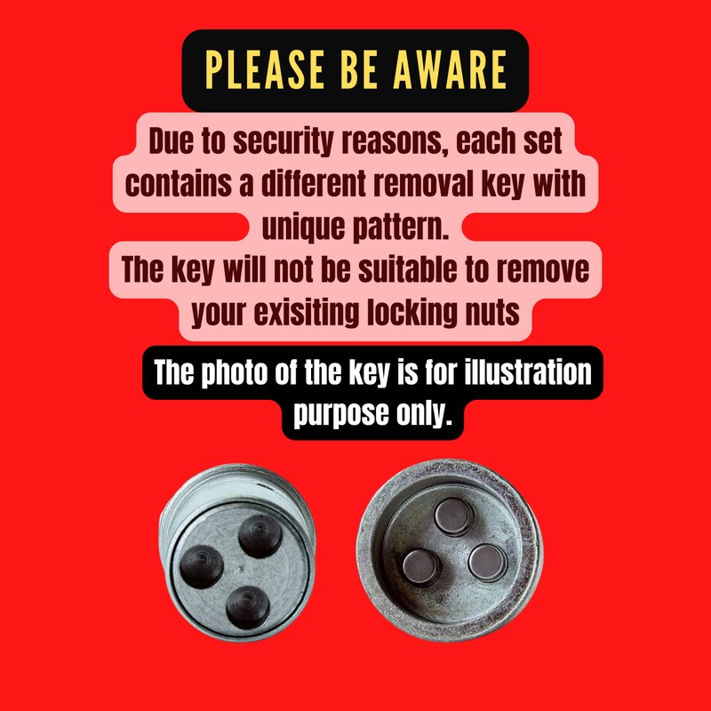 The key included in a box. Is not universal and it will not be suitable to remove your old bolts (nuts). Each box has a different pattern. We are not show correctly on the photo. It protects your car wheel from thieves !