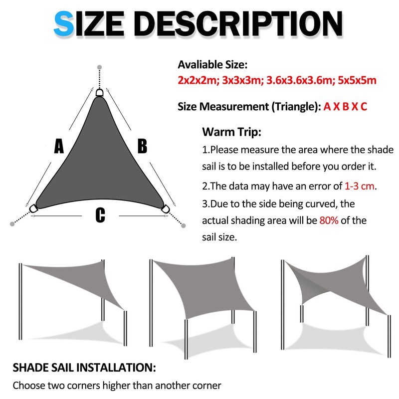 • Installation: Measure and clean the area where the sun shade is to be installed. the actual shaded area is slightly smaller, tolerance 10–15 cm for each side. You can install different shade sails in different colours and sizes to get a larger shaded area
