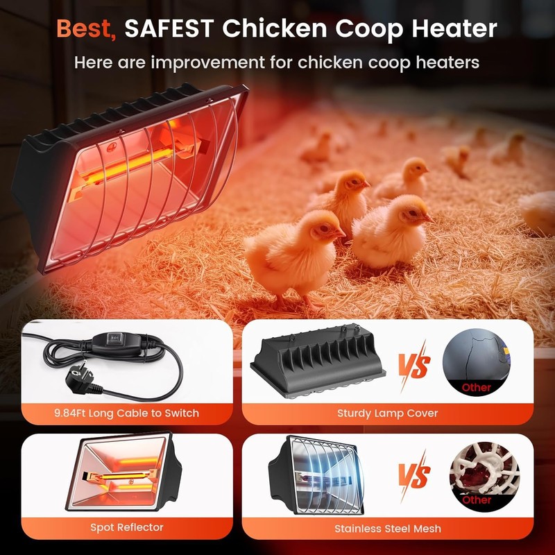 - Upgrade processed and durable safety: brood heaters are built into stainless steel materials. Durable mint grills help prevent damage to bulbs and animals. The scald-proof shell, waterproof grid and stainless steel mesh protect your chickens in all directions. Our chicken coop heater power cords are internationally UL listed and safe for use on small animals, poultry, reptiles and amphibians.