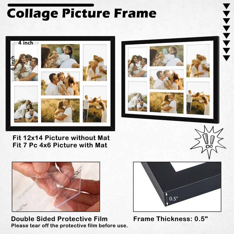 - Elegant Wall Decor: This 12x14 black collage picture frame with 7 opening white mat, fit 7 pcs 4x6 inch pictures with mat, or 1 pcs 12x14 inch photo without mat, is designed for wall hanging, adding a touch of modern style to any room. Its wood grain black frame and high-quality wood construction make it a perfect choice for displaying your cherished memories.