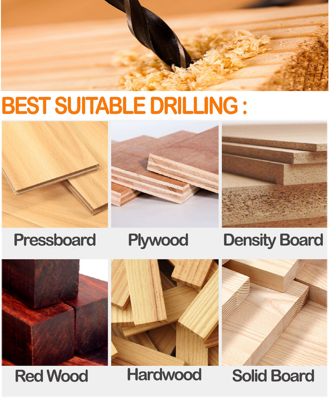 - Application: Cutting, Drilling Wood, Drilling Hardwood(Oak,Maple, Walnut,etc.), Drilling Softwood (Pine, Cedar, etc.), Drill Polywood, Drill MDF (Medium Density Fiberboard), Cutting and drilling laminates, Hole Drilling in Wood, Wood Cutting