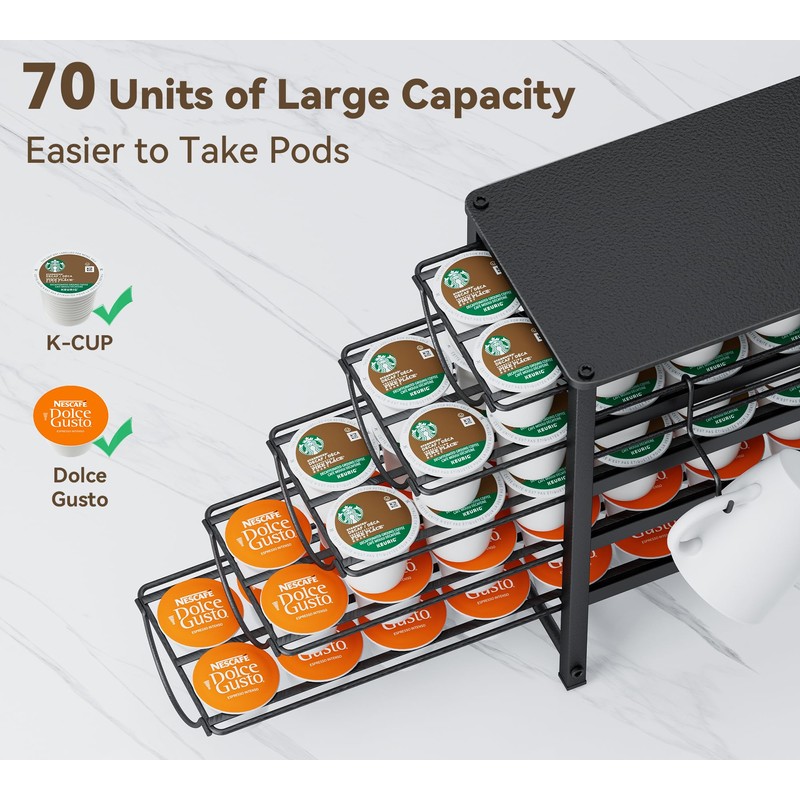 - 【Coffee Pod Storage】 Each row of k cup holders can hold 14 K cups, and the whole can store up to 70 K cups. You can place it next to your coffee machine, on your countertop, or in a cabinet, providing ample storage space. Coffee pods are not included