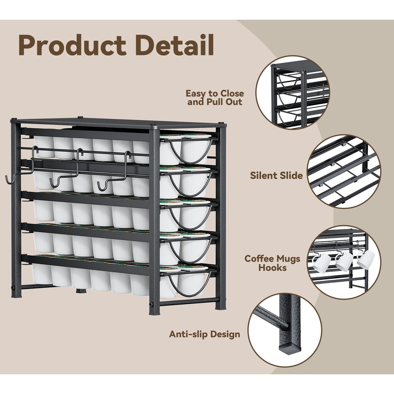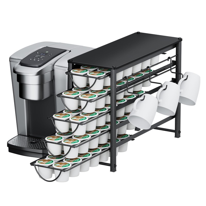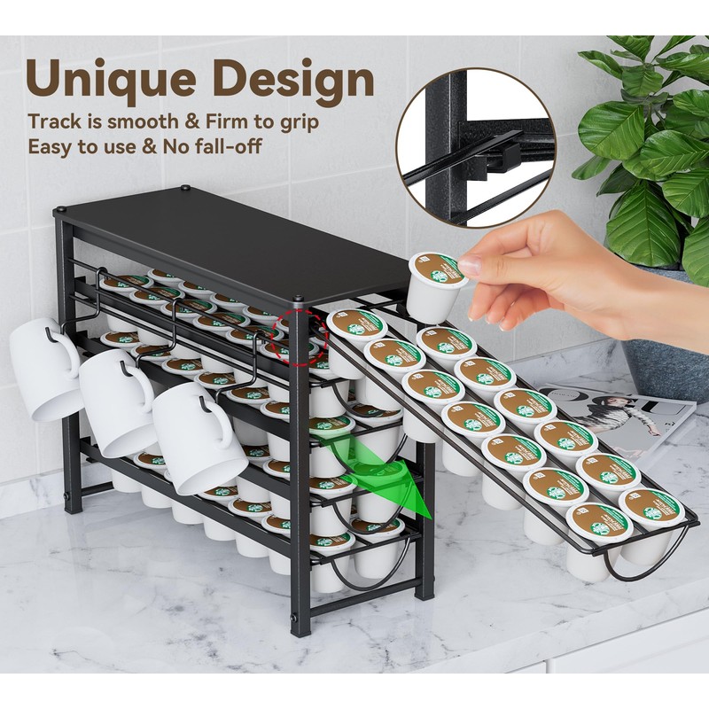 - 【Visible Design】The visible design allows you to quickly and easily find your favorite coffee flavor. The K-Cup holder features a sliding construction that is easy to pull in and out and has 3 mug holders on the side, which is perfectly suited to your family's needs, making it convenient to grab your coffee and neatly organize your coffee bar