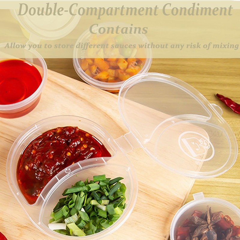 - 【Durable Quality Materials】Our double condiment container is made of food grade safety plastic, which is safe, environmentally friendly, sturdy, durable, and reusable. It is also microwave safe (temperature range :+120℃/-20℃) and refrigerator friendly.