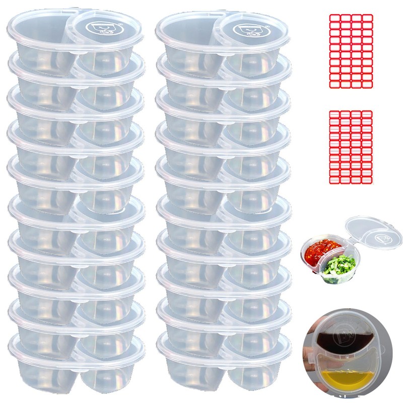 - 【What You Will Get】The kit includes 20Pcs 5oz Double Compartment Condiment Container and 2 Label Sticker. It is not only convenient for storing different snacks, sauces, or salad dressings without mixing, but also can assign names according to different sauces.