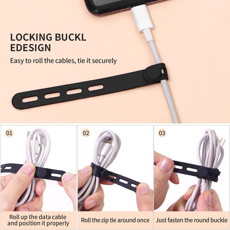 - Multi-Purpose Use - Beyond cable management, our silicone ties are ideal for securing hangers, food bags, curtains, umbrellas, and more. They can also be used as hair tie organizers or to organize small items. Their versatility makes them an essential tool for organizing both digital and physical clutter in any setting.