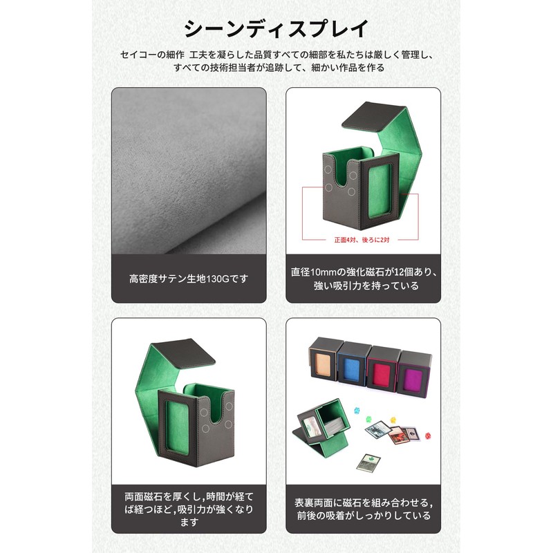 - (High Quality Materials and Design) The exterior of the deck case is made of high quality pressure discoloration PU leather, 0.02 inch (0.6 mm) thick leather, which is long-lasting and stain resistant and corrosion resistant. The interior is made of 130g high-density satin fabric, which reduces external impact and prevents cards and sleeves from bumps, scuffs, and bending. Soft to the touch, gently wraps your cards. The luxurious texture and design are lightweight and easy to carry, so you will be the focus of your friends