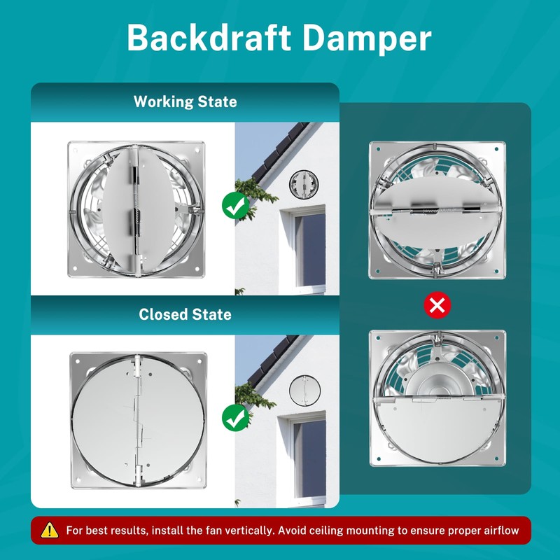 - Backdraft Damper Design: Safety is our top priority. That's why our exhaust fan is designed with a check valve that prevents airflow from reversing, thereby ensuring maximum protection.