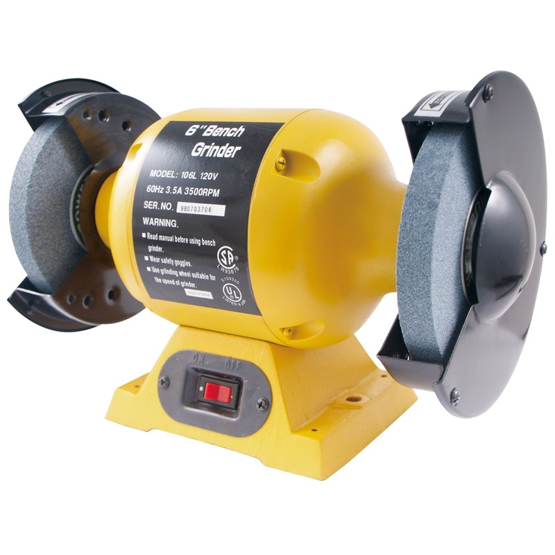 HHIP heavy duty bench grinder. Direct drive motor with no brushes or belts to adjust or replace. Permanently lubricated motor bearings. Adjustable shatter- resistant plastic eye shields. Removable wheel covers for easier wheel changes. Free speed: 3500 RPM. Adjustable tool rests. Power: 110 volts/ 1 phase. 6 feet wire cord. UL approved. 6-inches size. .5 HP.