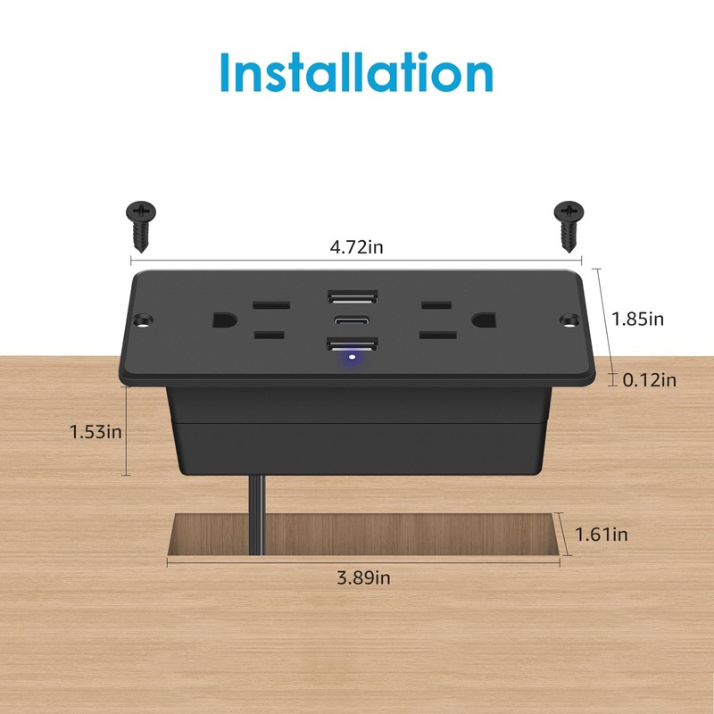 - Furniture Hidden Charging Station: Desk hole cut size: L 3.89" * W 1.61", Need space under the table: 1.53inch, it will be 0.12" higher than the surface after install. It comes with the two screws needed to mount it. After you make your cut to size, the power strip drops in place and covers the gap nicely. Even if it’s a rough cut, the top of the power strip is larger than the opening, hiding any imperfections. This would be ideal to do a recess install into a desk or workbench.
