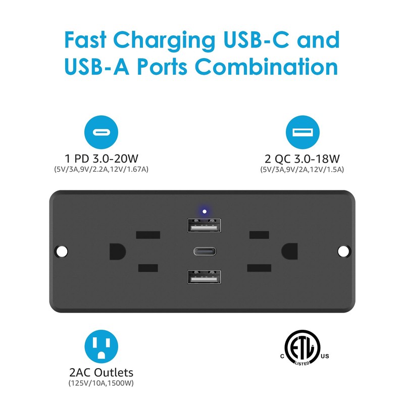 - 20W Fast Charging Power Strip: 2 Outlets Output rating 10 Amp / 125 Volt / 1250W. Come with fast charging QC 3.0 18W Max USB-A port and PD 3.0 20W Max USB-C port. Different phones, iPads, laptops, and many many other things and this has every single plug in one strip, USB, usb c, and standard plug. They charged fairly quickly too.