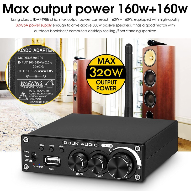 - [Upgrade!!! Newest version optimize the Bluetooth range and stability as well as sound quality] Using classic TDA7498E chip, max output power can reach 160W + 160W, equipped with high-quality 32V/5A power supply enough to drive above 300W passive speakers. It has a good match with outdoor/ bookshelf/ computer/ desktop /ceiling /floor standing speakers.