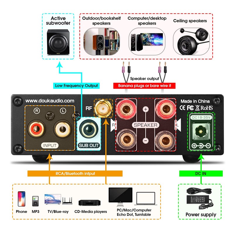 - Can build 2.1-CH audio system with its low frequency output for active subwoofer. The bass effects can be strongly enhanced. The sound is more delicate with treble and bass control, the shocking auditory effects make you feel like in the cinema.