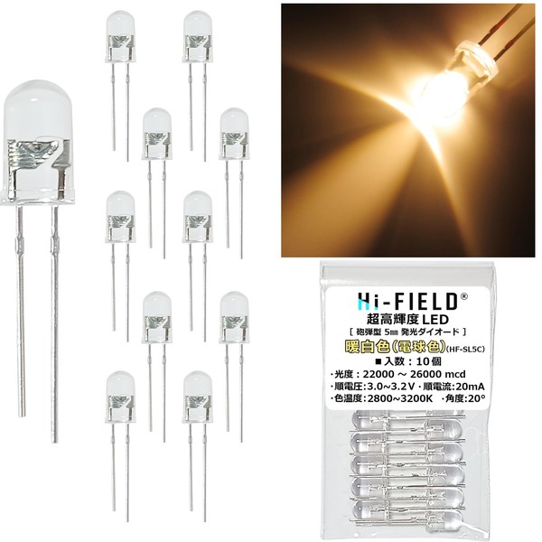 Hi-FIELD Super Bright LED Warm White MAX 26,000 mcd 20mA 20° Cannonball Type 5mm Light Emitting Diode, Pack of 10