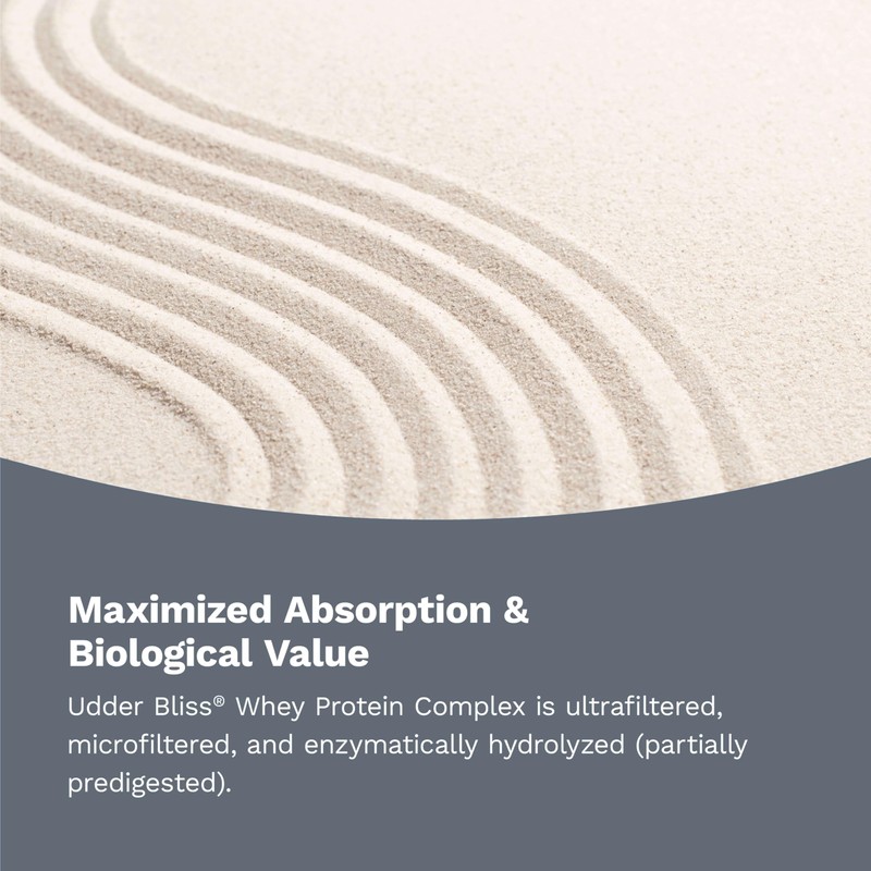 Udder Bliss Whey Protein Complex is ultrafiltered, microfiltered, and enzymatically hydrolyzed (partially predigested).