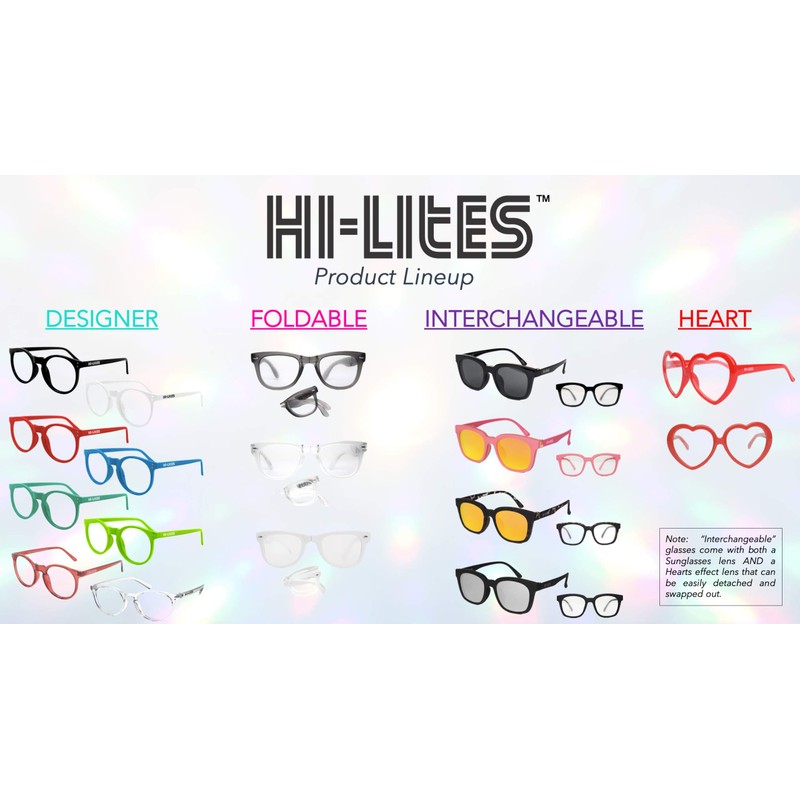 HI-LITES designer special effects glasses. All points of light viewed through our patented lenses will magically turn into Hearts! No wires, no circuits, just lights! Featuring sleek unisex design and patented light diffraction technology. All glasses come with their own protective cloth pouch.
