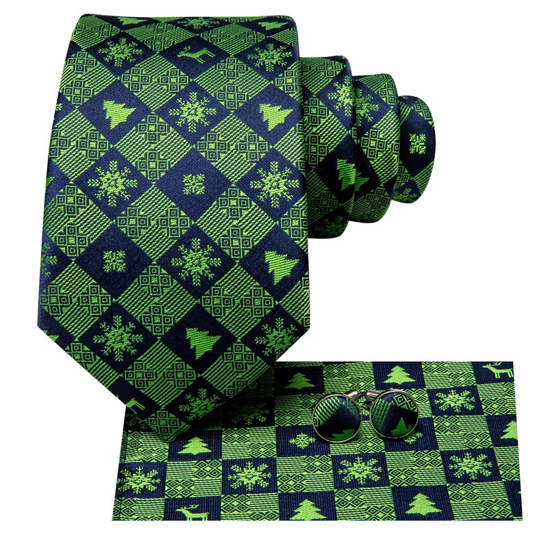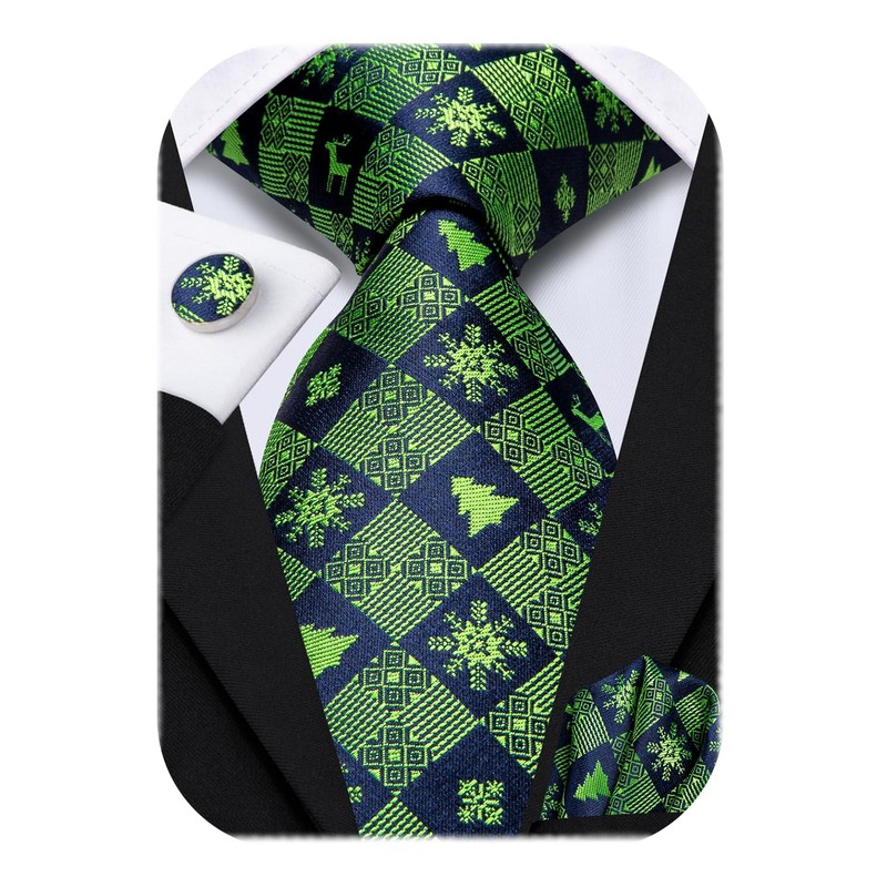 Hi-Tie Men's Christmas Tie Set Tie Pocket Square Cufflinks Set Match Reindeer Snowflake Xmas Tree Pattern for Wedding Prom, Green Forest