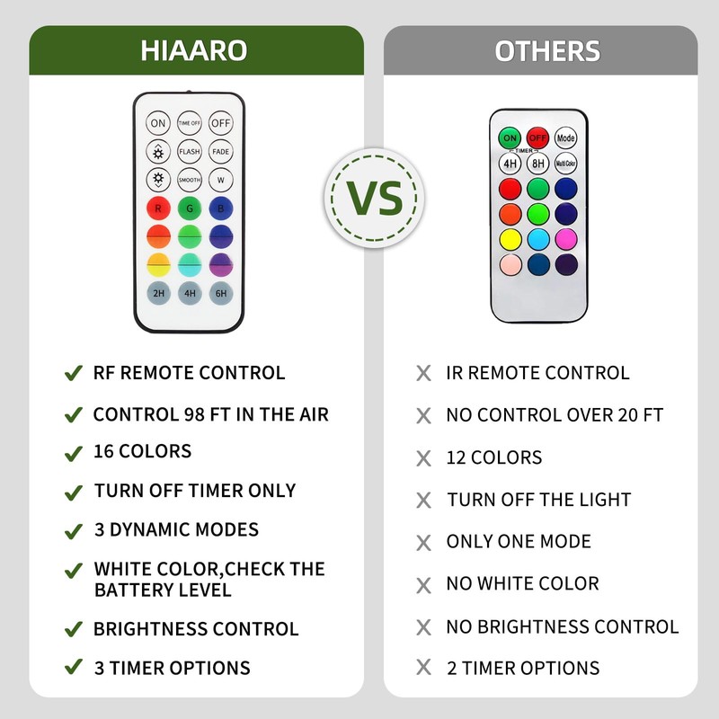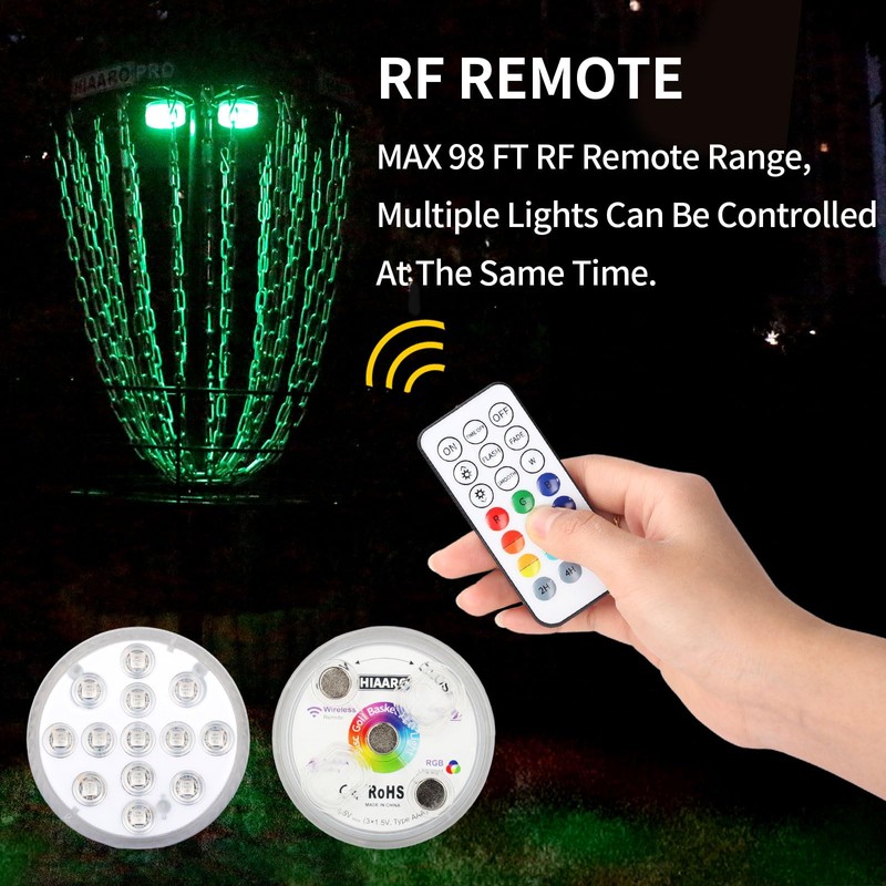 • 【RF Remote Control】HIAARO disc golf basket lights work with the RF remote control, they have a strong siganl. Control range in the air up to 164 feet and can control multiple lights at the same time without aiming the lights. Have to 16 dynamic colors, multiple modes. With the remote control you can easily change the colors or adjust the brightness remotely.