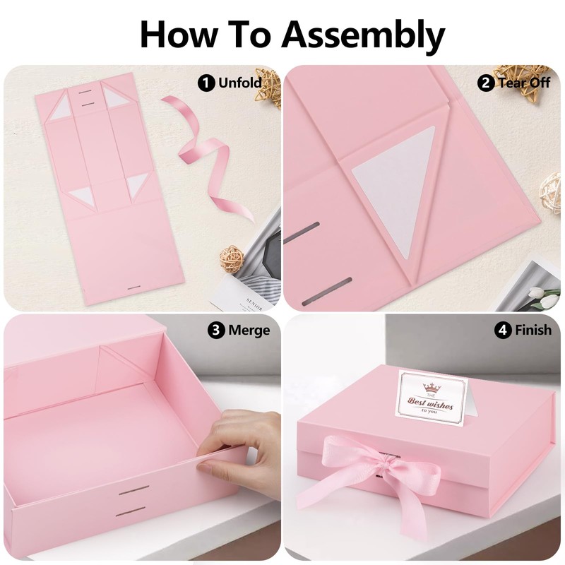 • 🎁Easy Assembly:No extra tape is needed, just peel off the triangular sticker, support the cardboard to form a box shape, press and reinforce the sticker connection, and then tie a beautiful bow with the ribbon to complete the assembly.