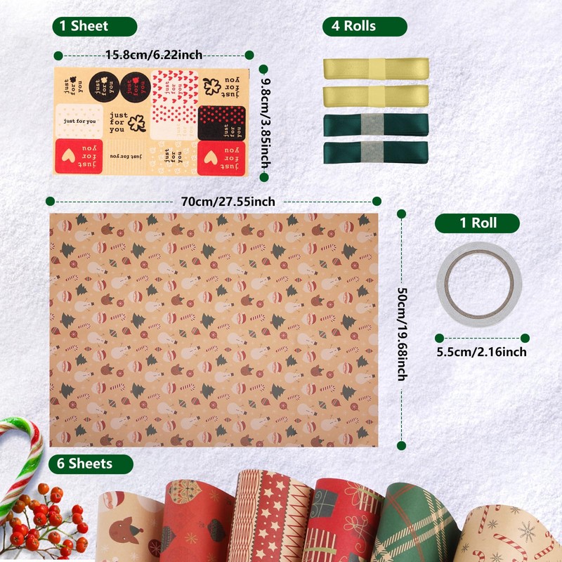 - 📦Package Included📦 Our wrapping paper set contains 6 sheets Wrapping Paper, 1 sheet Gift Stickers, 4 Ribbons, 1 Double-sided tape.