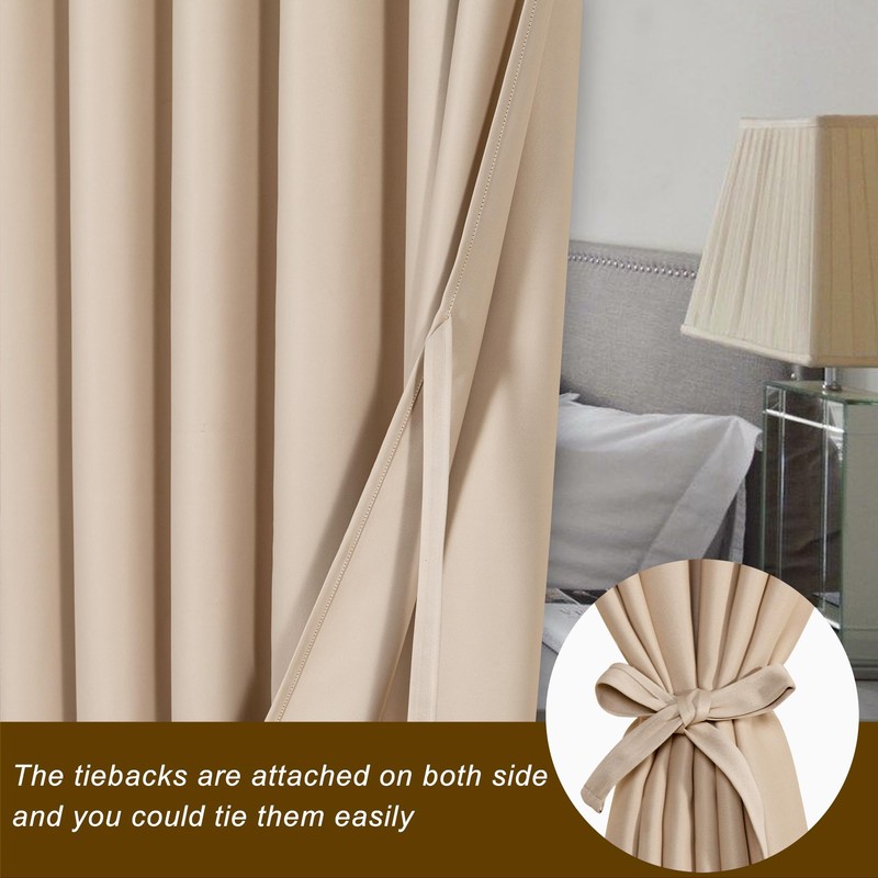 - The patent tiebacks:Two tiebacks sewn to the Hiasan's divider blackout curtains both sides can adjust it according to the shelter effect you want and offer a contemporary solution for holding drape panels without the need for tools or drilling holes into trim or walls