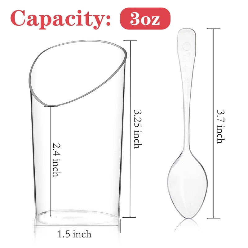 Hiasobre 50 Pack Plastic Dessert Cups with Spoons, 3 oz Clear Mini Parfait Appetizer Cups, Reusable Slanted Triangle Shooter Serving bowls for Tasting, Small Dessert Shot Glasses