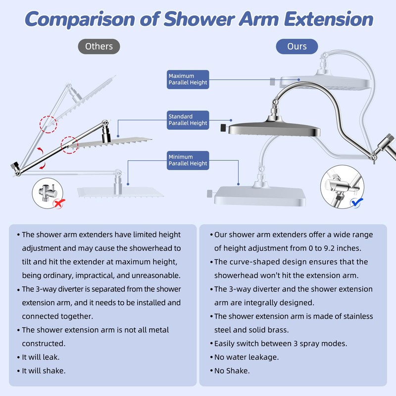 - [Upgraded Curved Shape Extension Arm with 3 Way Diverter] The Hibbent shower arm is crafted from long-lasting all-metal material, ensuring strength while preventing leaks and wobbling, It is equipped with upgraded curved shape shower arm which allows you to raise or lower the shower head while keeping it in a horizontal position, preventing any collisions with the arm. The 3-way diverter shower arm offers a versatile combination of four spray modes: Handheld Spray, Rainfall Spray, Rainfall + Handheld Spray, catering to all your showering needs