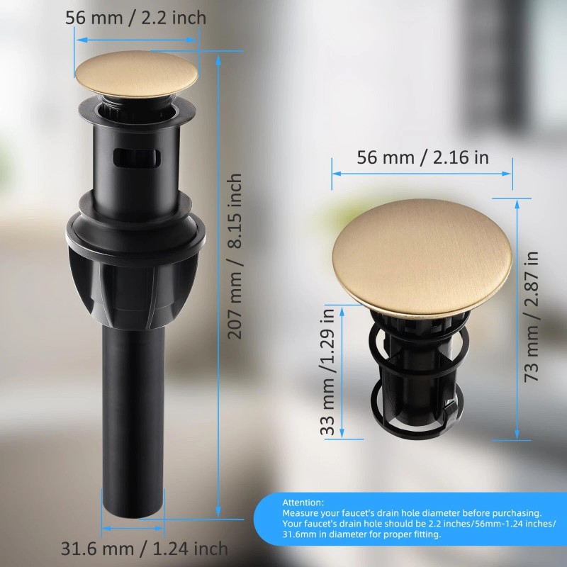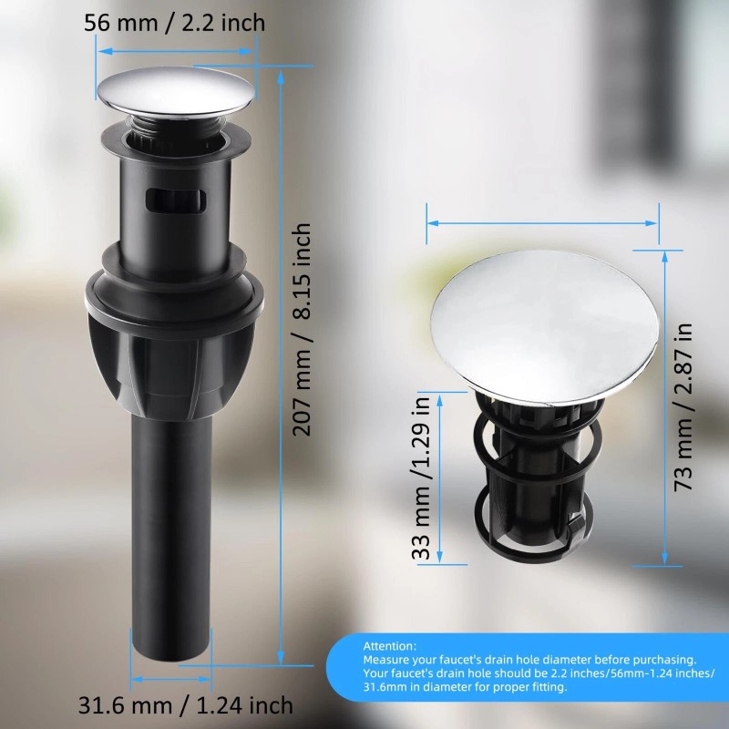 - Pop-up Drain Stopper with Overflow: It fits sink drain diameter of 1-5/8” to 1-3/4”. It does NOT fit for 1 - 1/2" sink hole, please check the size of the sink hole before purchasing.