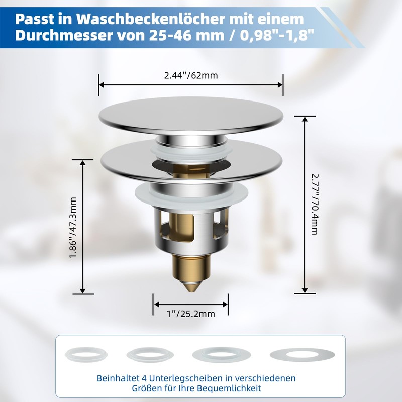 - Easy Installation The pop up drain plug has a simple structure that does not require any tools for installation; just remove the old drain plug and insert the new one. If you want to use it for larger sink holes, the included rubber rings can be used to increase the inner diameter of the plug.