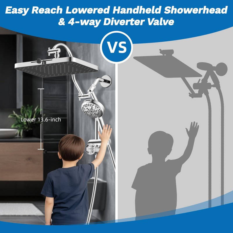 - [Easy Reach 4 Way Diverter Shower Extension Arm] The innovative 4-way diverter shower arm is crafted from long-lasting all-metal material, ensuring strength while preventing leaks and wobbling with its integrated design. It offers a versatile combination of four spray modes: Handheld Spray, Rainfall Spray, Rainfall + Handheld Spray, and Pause Mode, catering to all your showering needs. The lowered 4 way diverter design is suitable for both adults and children, while the adjustable handheld holder allows for various angles and is longer than standard brackets, minimizing splashes and enhancing your overall shower experience