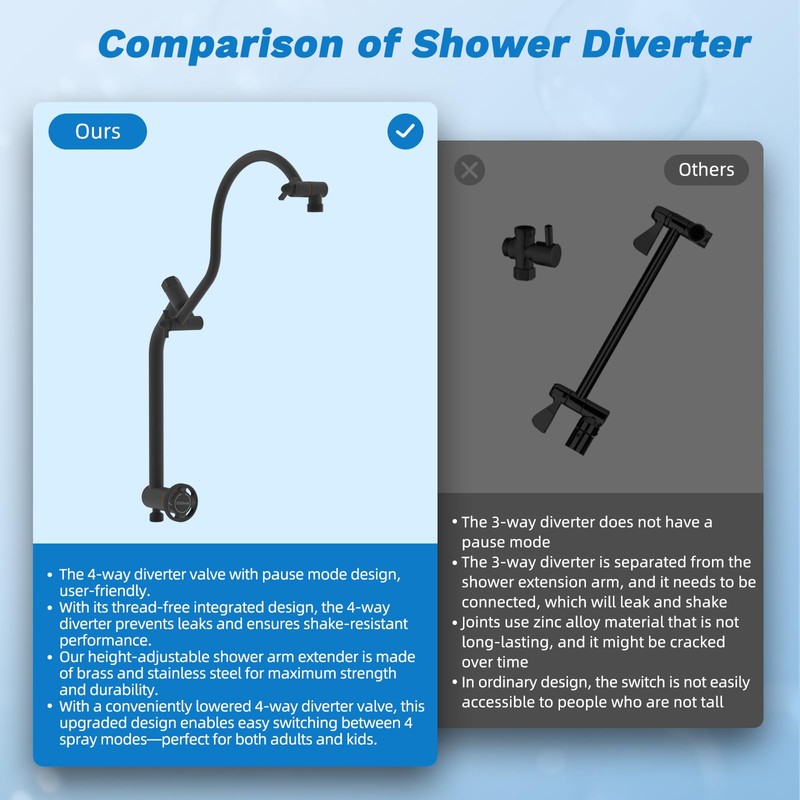 - [Accessible 4-Way Diverter Valve] Our enhanced easy reach 4-way diverter valve is constructed from sturdy all-metal materials, ensuring superior durability. Its integrated design prevents leaks and reduces wobbling, guaranteeing dependable operation. Positioned lower for easy reach, this diverter allows both adults and children to switch seamlessly between the handheld shower head and four spray modes, maximizing convenience during use