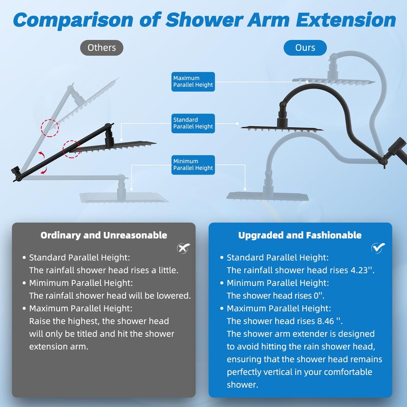 - [Curved Shape Shower Arm & Simple Setup] The Hibbent shower arm extension is designed to adjust the height of your shower head while keeping it level, preventing any potential collisions. Installing it is a breeze, as it comes with all the essential hardware and instructions, enabling you to quickly and easily integrate your new shower system. No need for professional installation! (Note: If your current shower arm is incompatible, please reach out to our customer support team for help.)
