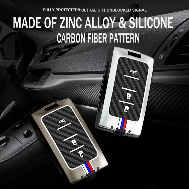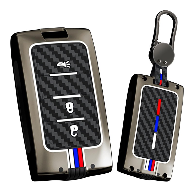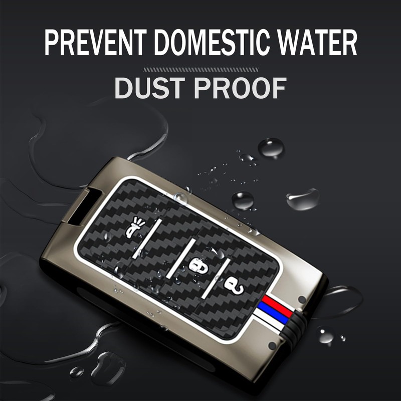 - 【Material & Design】:Zinc alloy shell is strong and durable;Carbon fiber texture pattern, fashionable and high-end; the 3D tactile silicone buttons are comfortable to press, soft, wear-resistant and dirt-resistant; the three red, white and blue lines on the key shell will emit fluorescence at night, Helps us find our keys quickly in total darkness (the light bar is made of fluorescent or phosphorescent materials, which needs to absorb energy from external light sources)