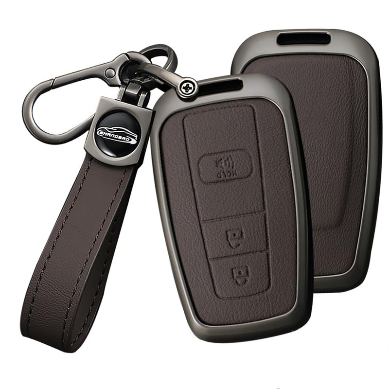 HIBEYO 3 Button Key Fob Cover Compatible with Toyota 4Runner 2016-2024 RAV4 Camry Prius Prado Key Leather & Alloy Key Cover Accessories with Keychians-A Keychain Brown