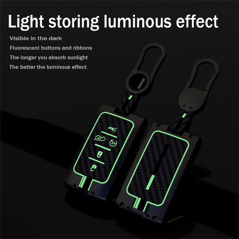 - 【Material & Design】:Zinc alloy shell is strong and durable;Carbon fiber texture pattern, fashionable and high-end; the 3D tactile silicone buttons are comfortable to press, soft, wear-resistant and dirt-resistant; the three red, white and blue lines on the key shell will emit fluorescence at night, Helps us find our keys quickly in total darkness (the light bar is made of fluorescent or phosphorescent materials, which needs to absorb energy from external light sources)