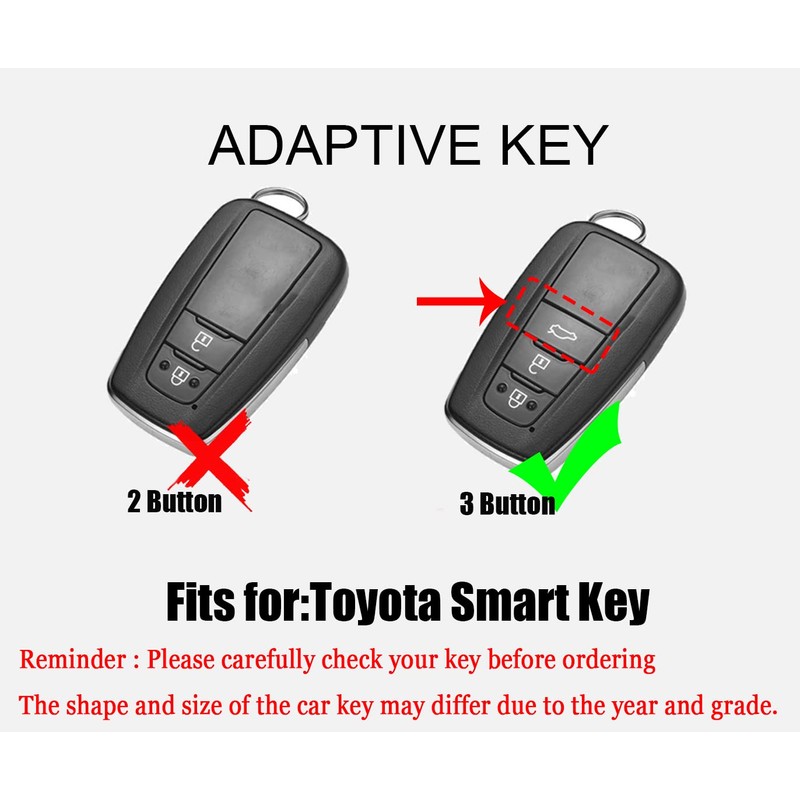 • 【Compatibility】:The car key fob cover compatible with 2019-2021 Toyota RAV4 2018-2021 Toyota Camry 2020-2021 Toyota Highlander 2019-2021 Toyota Corolla 2019-2021 Toyota Avalon 2017-2021 Toyota C-HR, 2017-2021 Toyota Prius 2018-2021 Toyota GT86 3 buttons smart auto key etc.{The shape and size of the car key may differ due to the year and grade.Please ensure your original car key look the same as photo 2 before ordering.}
