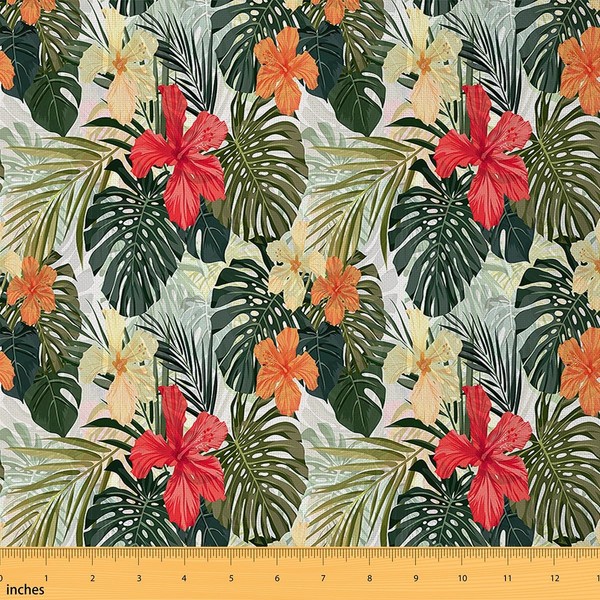 Hibiscus Flower Palm Tree Upholstery Fabric by The Yard - Hawaiian Tropical Decorative, Island Botanical Indoor/Outdoor, Waterproof, Green & Red, 2 Yards