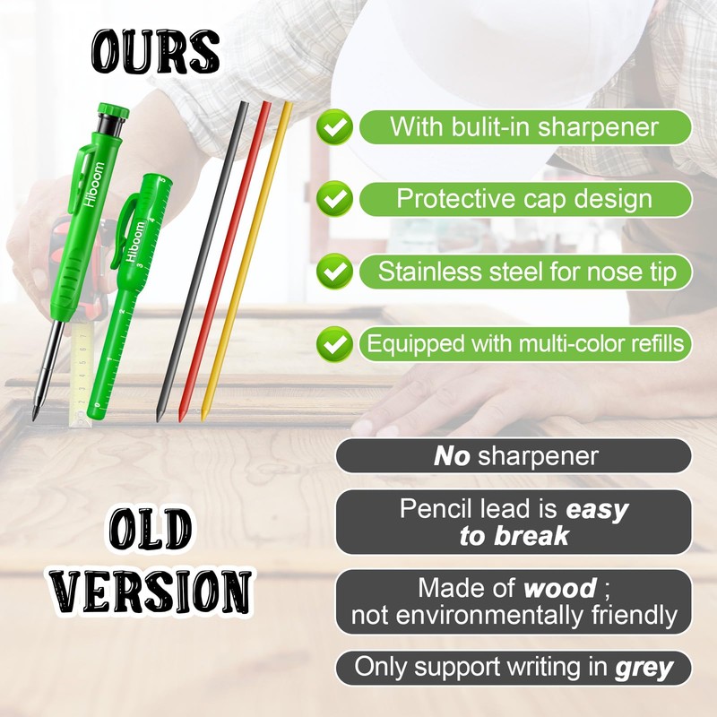 - Complete Carpenter Pencil Kit: this carpenter pencil marker set includes 2 green deep-hole wooden carpenter pencils with a built-in sharpener of each other, 18 black refills, 3 red and 3 yellow refills, and, providing everything you need for precise and versatile marking