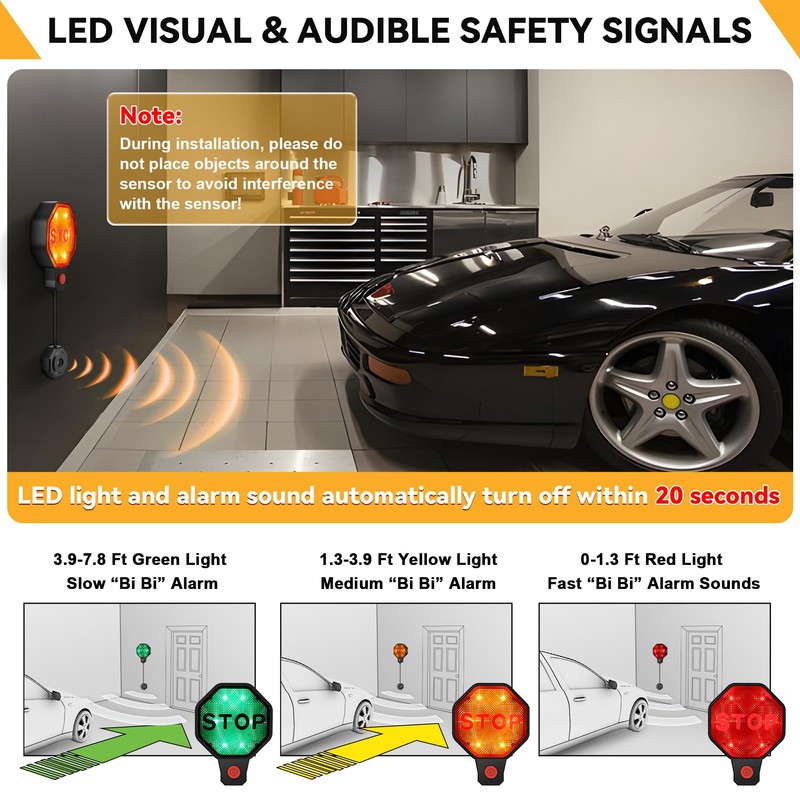 - [Effortless Parking Precision for Your Garage] Our garage parking aid transforms the way you park, offering unparalleled accuracy with an intelligent parking assist sensor. The LED system offers intuitive signals: green light (3.9-7.8ft) for safe approach, yellow light (1.3-3.9ft) for caution, and red light (0-1.3ft) with an audible alarm to alert you to stop immediately. With this system, you can eliminate the guesswork and park confidently without risking scratches or damage.
