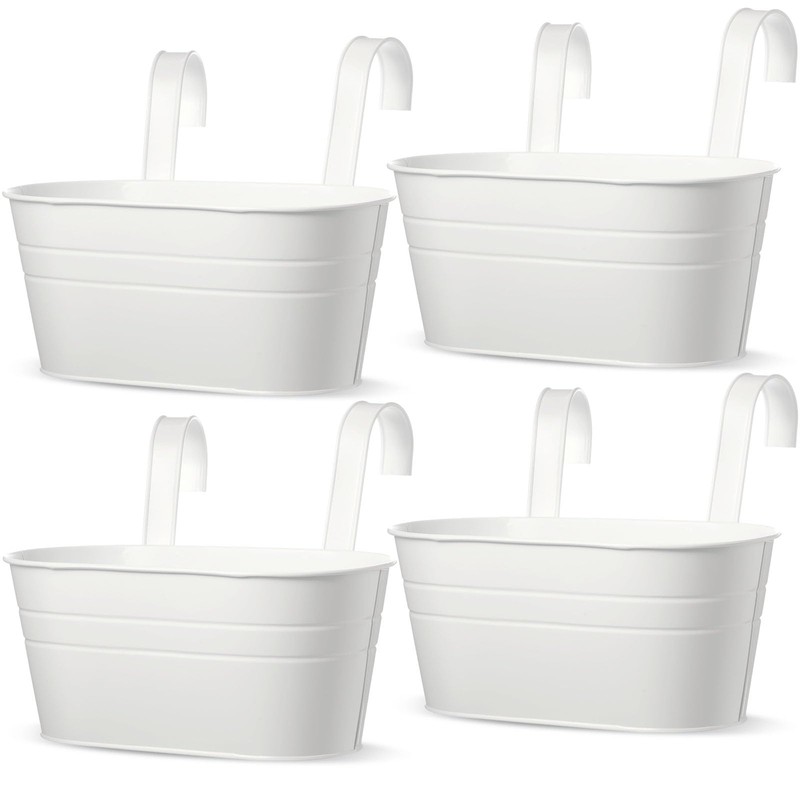 Hicarer 4 Pcs Metal Hanging Flower Pot Outdoor Plants Iron Hanging Bucket Planter Outside Fence Planter Boxes Holder Bulk with Detachable Hook for Wall Garden Balcony Window Indoor (White)