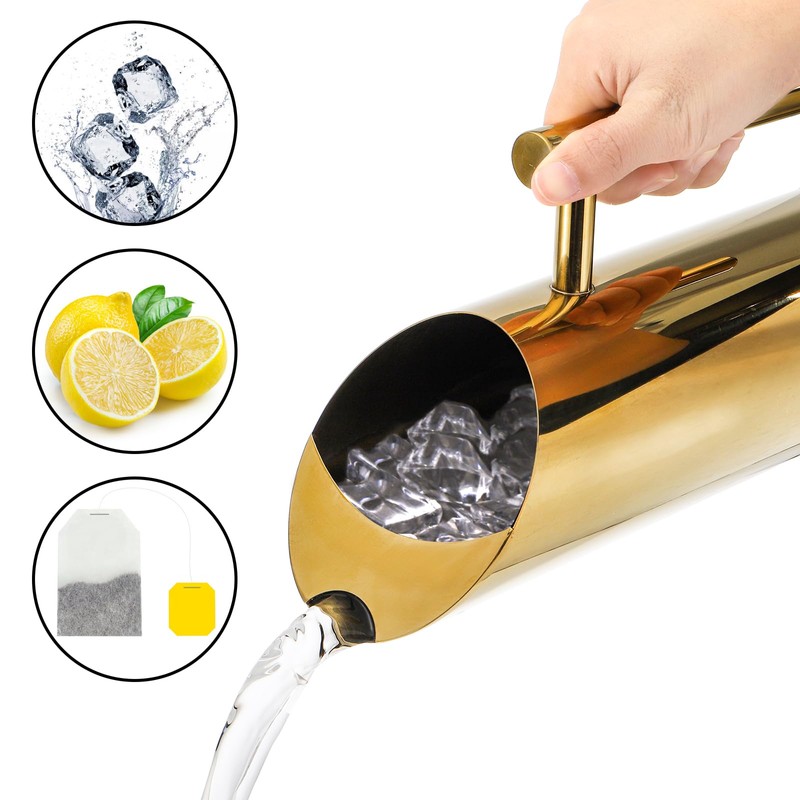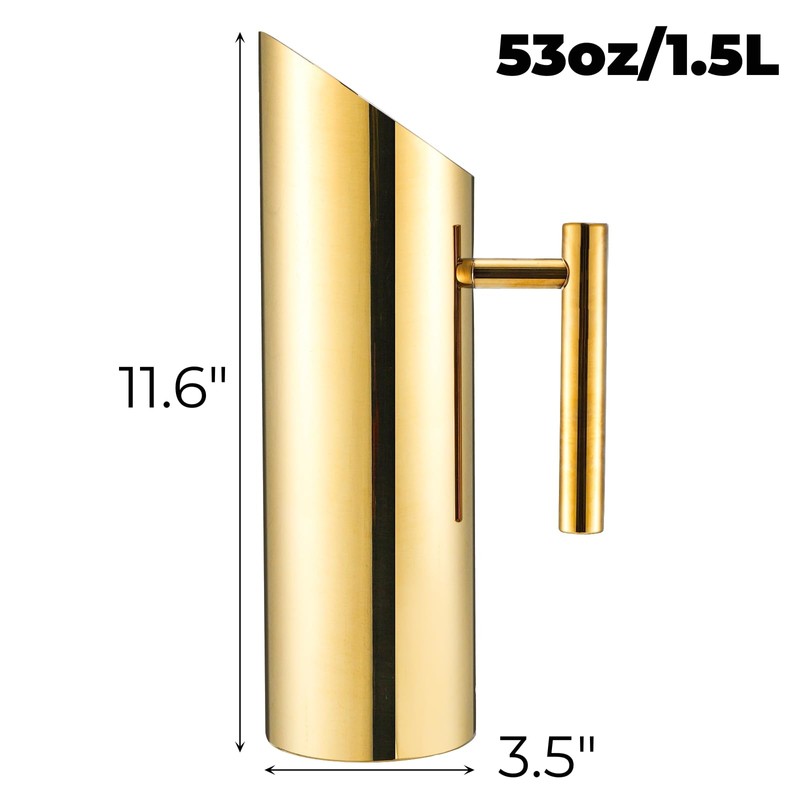 - 【Generous Capacity】 With a capacity of 1.5 liters, this water pitcher is perfect for serving large gatherings or keeping yourself hydrated throughout the day. This stainless steel pitcher features a stylish gold finish that adds a touch of elegance to any kitchen or dining table.