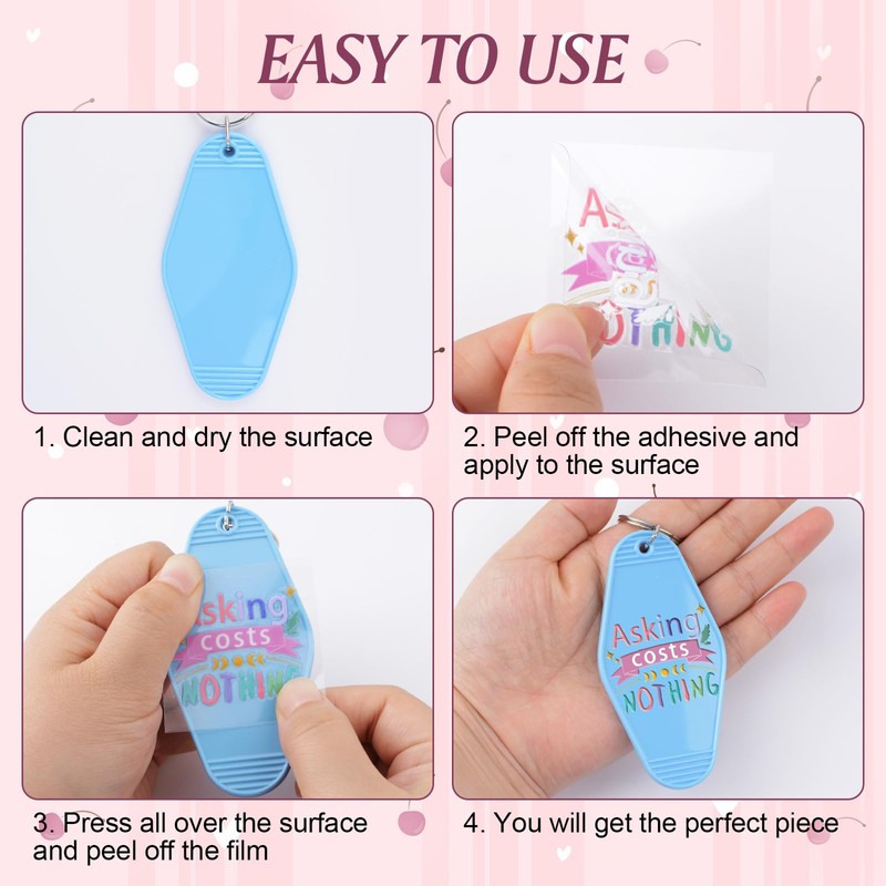 - 【Wide Applicability】:Our UV DTF keychain stickers can not only be used for keychain design, but also can be applied to decorate other items such as motel keychains, backpacks, phone cases, bottles and more. These transfer stickers are available in pieces to meet your different decorative needs.
