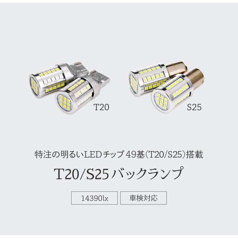 - Bulb Type: S25; Brightness: 14390 lx Manufacturer's measurements [Number of Kelvins] 6,500 k (white) [LED chip] custom made bright LED chips 49 lights [Voltage] 12 V vehicles [Power consumption] 28.8 W [Installation location] Back lamp [Product contents] 1 set of 2 bulbs