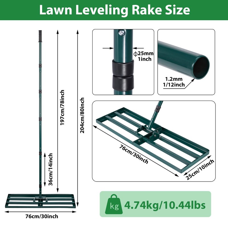 - Adjustable Handle: 78 Extra long handle lets you cover more ground with less effort. The perfect size saves your time and energy to levels soil and dirt evenly. You could adjust the length by removable handle section based on your needs.